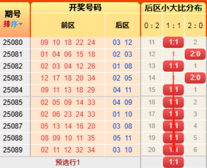 上期后区开出小大比为1:1,上期命中