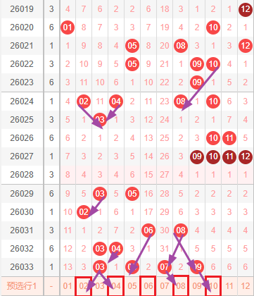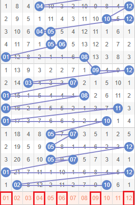 如图,近期01.12较热,首位呼应,04.06间隔12.11期未开出,可作为备选,09与上期的10呈斜连趋势。