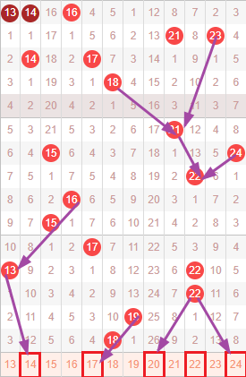 20截止目前已间隔26期未开出,可以重点关注下,22.24呈偶数连号,14可作为备选号码。