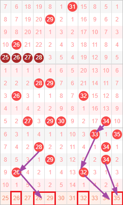 如图,三区推荐28.29小连号,26.32.35为备选号码,其中35重点关注。