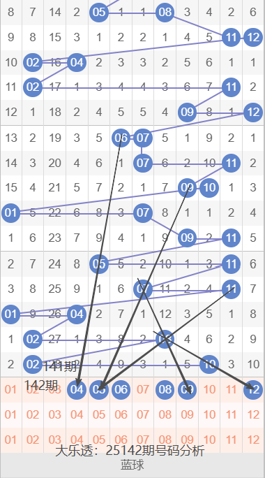 通过上期号码的简单分析,我们看下25142期红色号码球的总体走势,如下图: