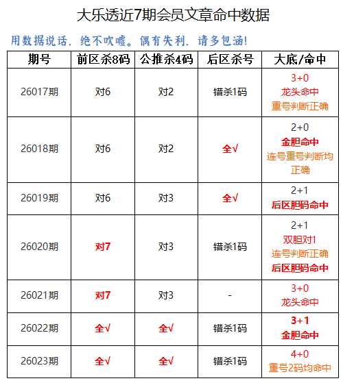 上期前区杀8码全对,公推杀4码全对。会员文章中重号2码均命中,大底命中4+0,本期再接再厉。