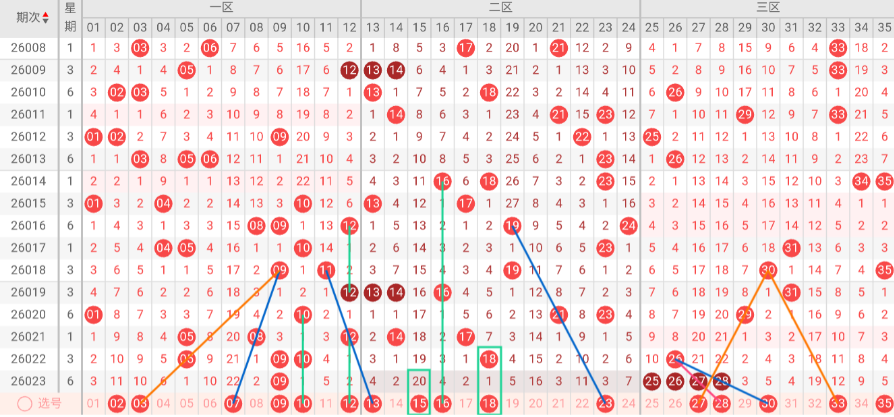 在经历连续两期3码的峰值后,上期回落至1码,呈现典型的冲高回落形态。这种走势表明一区的能量在经历了爆发性释放后,正处于快速冷却阶段。上期仅开出1枚,结束了此前连续3期的高热状态。本期有两种可能:一是继续探底,甚至出现断档;二是在1枚的基础上小幅反弹至2枚。考虑到近期整体热度仍存,回落幅度温和,且09作为重号仍保持热度,显示该区并未彻底冷清。所以更倾向于前者,即继续低位运行甚至断档。推荐关注号码:02、03、07、10、12。