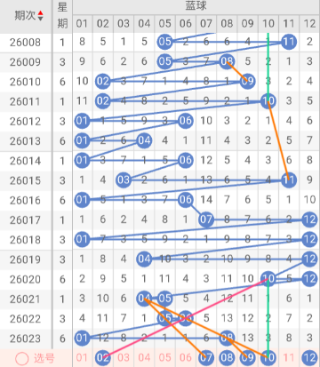 蓝球号码在大小比上期为1:1,奇偶比1:1。近10期后区跨度在1-11之间。