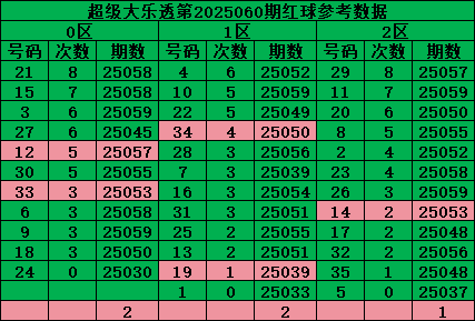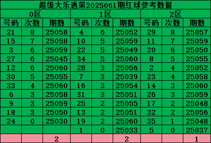 把01-35分成三个区:0区、1区、2区,0区是11个号码。1区是12个号码,2区是12个号码,出号次数排名前四的是热号,出号次数排名后四的是冷号,出号次数排名中三、中四的是温号,用每个区最大遗漏的号码的期数提取数据分析各区出号情况: