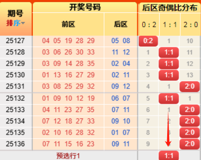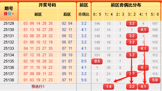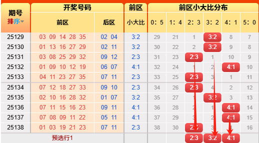 上期前区小大比2:3,推测正确,近期统计58期中52期。言归正传我们继续用历史数据说话,前区小大比分成6051423324150(如图),我统计了一下历史出现次数,05出现106次、14出现513次、23出现973次、32出现808次、41出现353次,50出现53次,再看近10期小大比出现次数比为004330,通过历史数据对比观察以及根据遗漏对称理论原则,故本期我们选择2:3、3:2、4:1(具体精准方向请查看小车小大比精选)