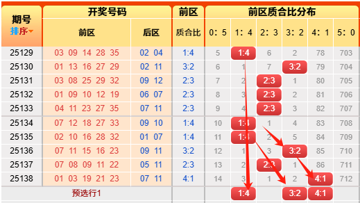 上期质合3:2,近50期命中48期范围。来看历史次数统计05出现269次、14出现906次、23出现1010次、32出现513次、41出现101次、50出现7次,再看近十期质合比出现的次数比0:34210,冷值50暂时放弃,再结合图形来看,本期趋势看顺路,初步选择为4:11:43:2具体请点击本条上车查看精选质合比