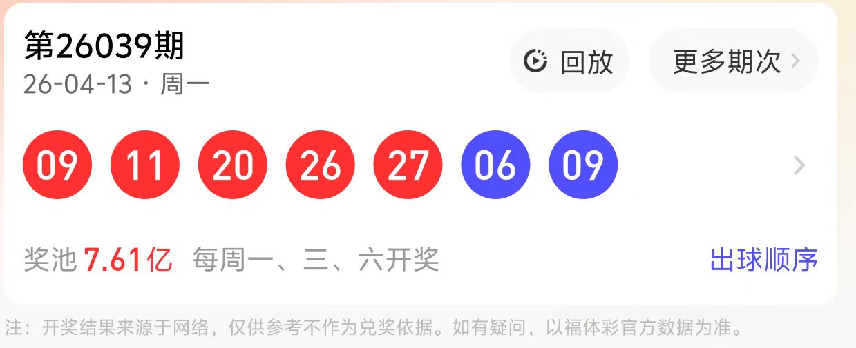温馨提示:彩票开奖为随机概率事件,无固定规律可循,建议大家理性购彩、量力而行,以娱乐心态看待。