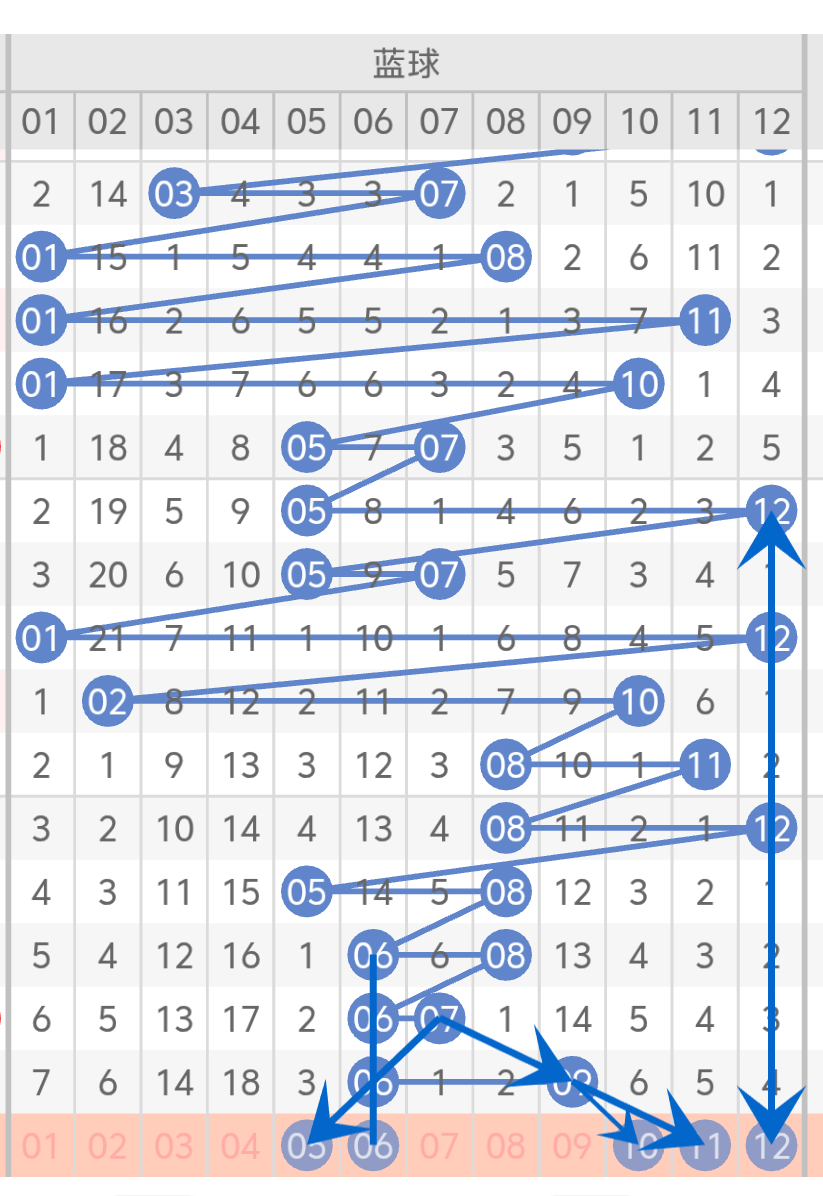 近3期蓝球号码开出06、07、08、09、号码,通过走势图及奇偶分析,本期推荐关注05、06、10、11、12等号码。
