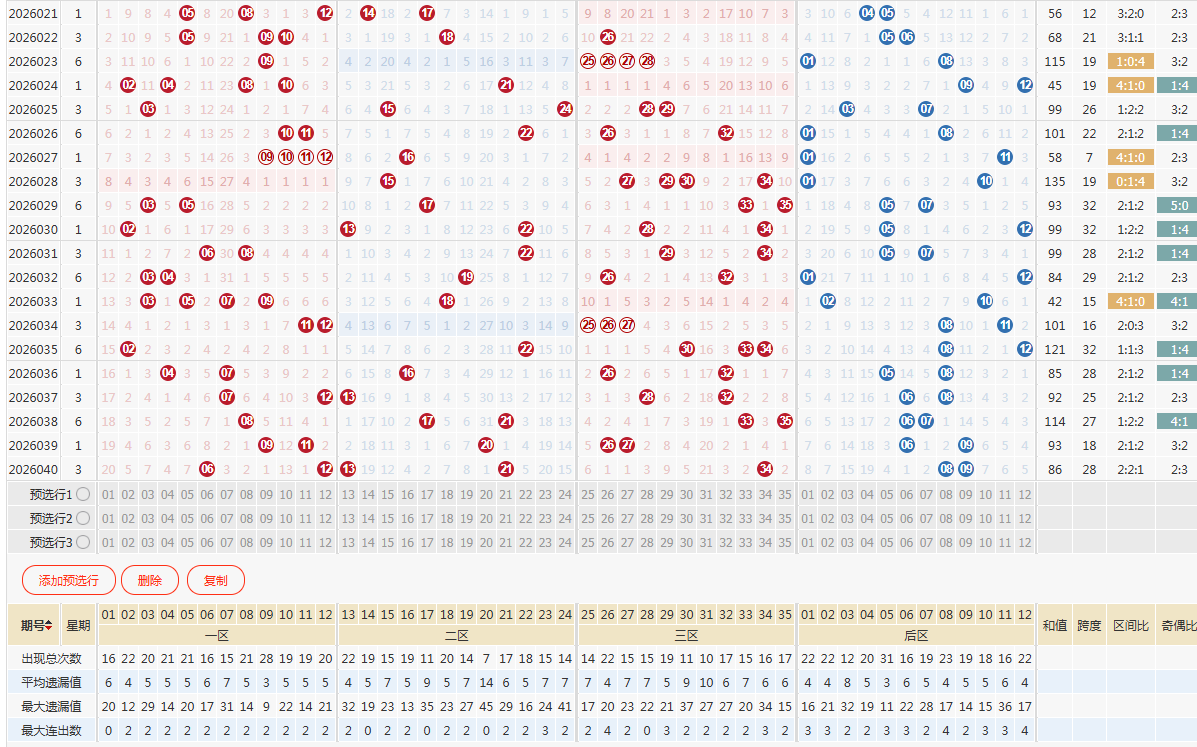 第一步:取近百期数据定前区预选号15码和杀号8码