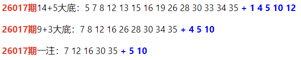 26018期14+5大底:1 2 5 6 8 9 15 19 20 22 23 31 34 35 + 1 2 5 6 8
