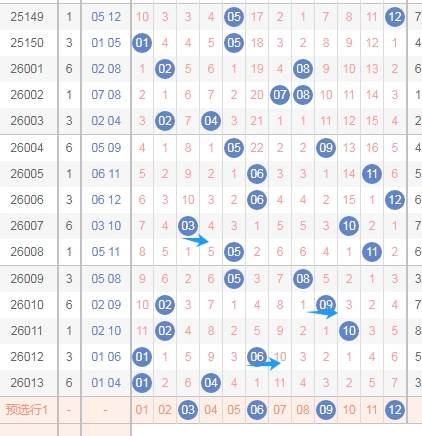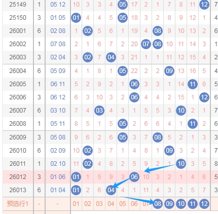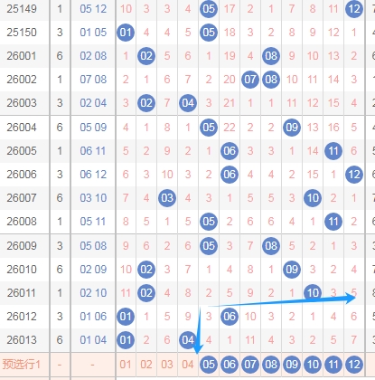 上图中标注出来的蓝色箭头表示的就是后区第二个数字之间的跨度,你们看后区第二个数字走到了04,那么本期后区第二个数字的范围应该是08 09 10 11 12,因为号码一直走到了差不多最左边的地方,那么号码会反弹的概率还是有的,所以关注后区第二个数字范围08 09 10 11 12。