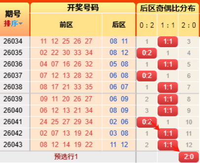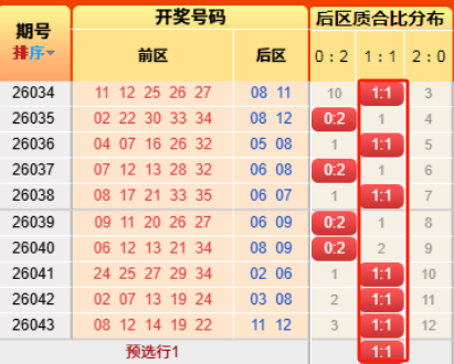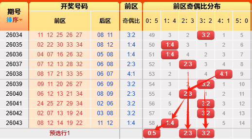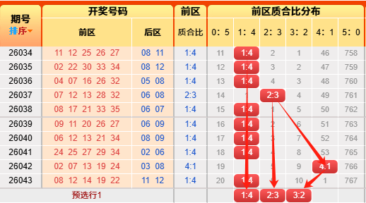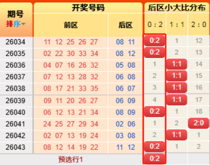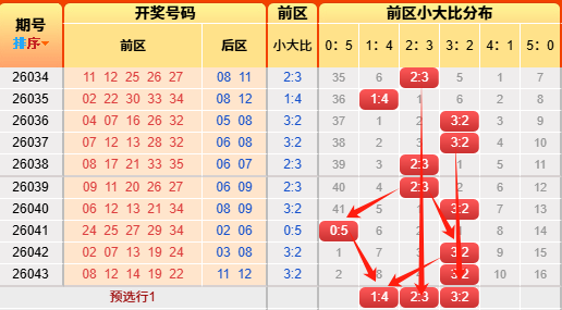 上期前区小大比3:2。言归正传我们继续用历史数据说话,前区小大比分成6种0:5、1:4、2:3、3:2、4:1、5:0(如图),我统计了一下历史出现次数,0:5出现108次、1:4出现520次、2:3出现989次、3:2出现828次、4:1出现359次,5:0出现57次,再看近10期小大比出现次数比为1:1:3:5:0:0,通过历史数据对比观察以及根据遗漏对称理论原则,故本期我们选择2:3、3:2、1:4;(具体精准方向请查看小车小大比精选)
