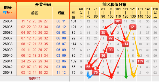 上期开出和值75。本次我们先根据历史次数统计,和值60以下开出256次、61-70开出241次、71-80开出377次,81-90开出493次、91-100开出505次,101-110开出386次、111-120开出316次、121-130开出157次、131-140开出91次、141-150开出27次、150以上开出9次,再来看近十次以上和值分别开出了1次、0次、0次、3次、2次、1次、1次、1次、1次、0次、0次 ,低于阈值的有60区间以下、61-70区间、81-90区间、91-100区间、101-110区间、121-130区间,再根据遗漏斜率对称理论,本期注意61-70区间、91-100区间、111-120区间、121-130区间。