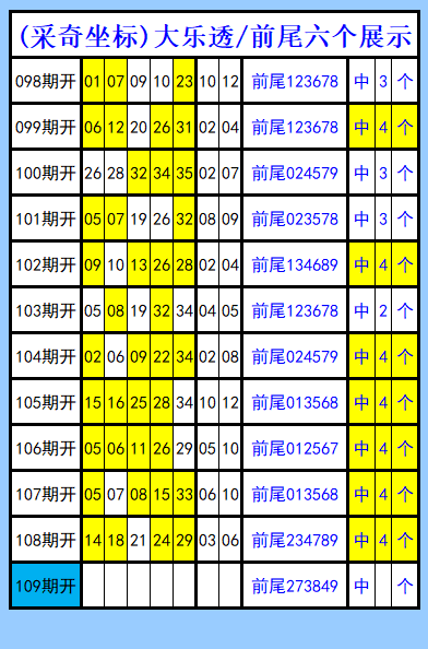 大乐透第109期图文(采奇坐标),前尾六个展示