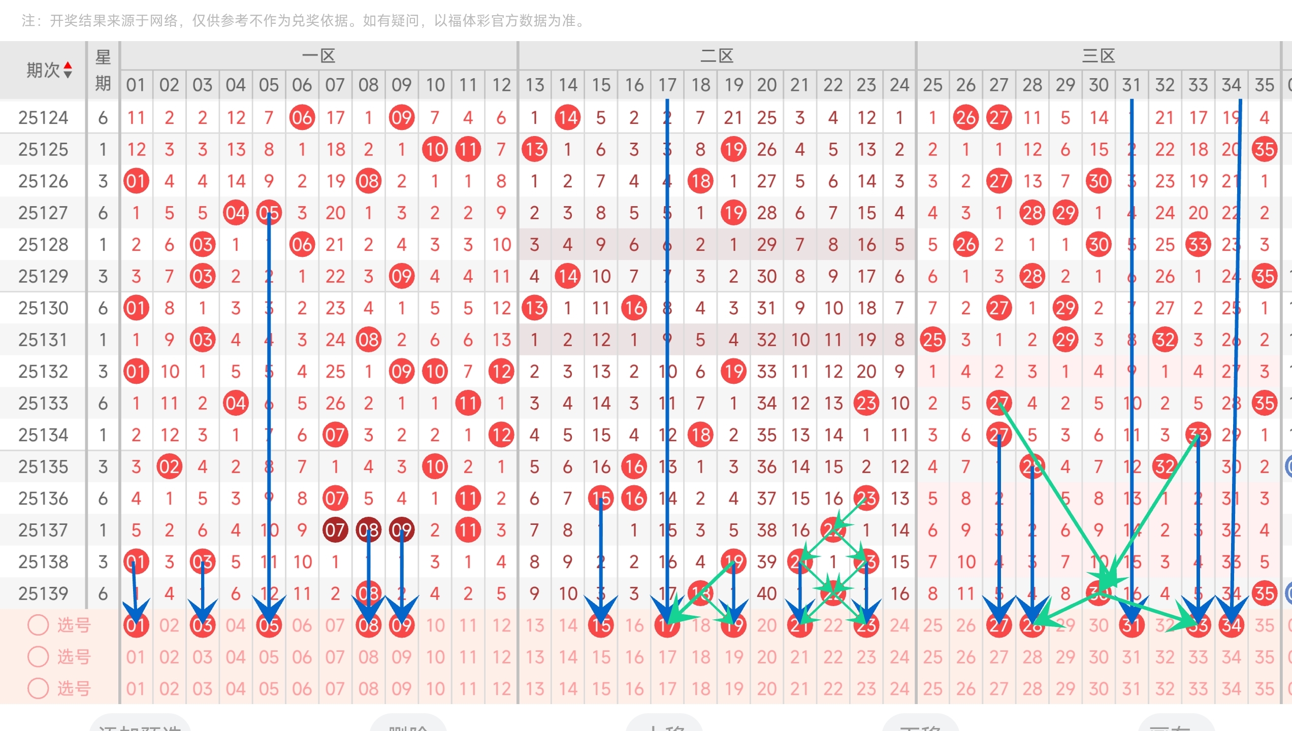 上期开出了3035号球,往前一期没有开出号码。通过分析走势图,可以看到在经历连续3期断区后,号码终于回补三区,推测本期大概率还会有号开在三区,可能开1码。上期号码开了中间和右边的号码,本期看好凤尾继续开右边。除了凤尾以外的号码看好左边号码回补。最后再结合冷热号和遗漏期数,本期我们可以关注2728313334等号。综上所述本期三区我们推测可能会开2728313334等号码。