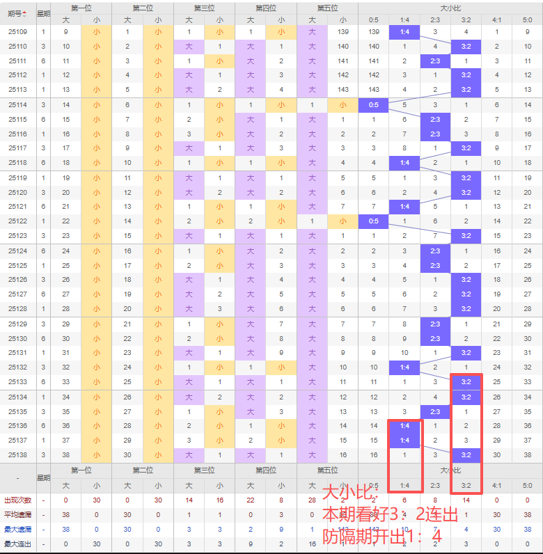 上期大小比:3:2,近10期大小比出现情况:2:3、2:3、3:2、1:4、3:2、3:2、2:3、1:4、1:4、3:2,最近10期出现4期3:2,出现3期2:3,出现0期4:1,出现3期1:4,出现0期5:0,出现0期0:5,根据近10期规律本期看好连出的3:2,防隔期开出的1:4,综上所述推荐大小比推荐:1:4,重点关注:3:2。