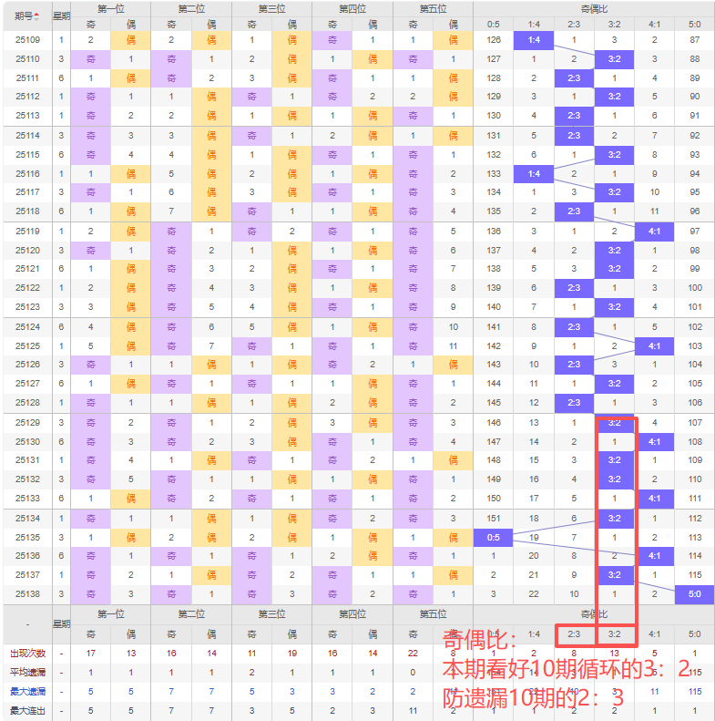 上期奇偶比:5:0,近10期奇偶比出现情况:3:2、4:1、3:2、3:2、4:1、3:2、0:5、4:1、3:2、5:0,最近10期出现5期3:2,出现0期2:3,出现3期4:1,出现0期1:4,出现1期5:0,出现1期0:5,根据近10期规律本期看好10期循环的3:2,防遗漏10期的2:3,综上所述推荐奇偶比推荐:2:3,重点关注:3:2。