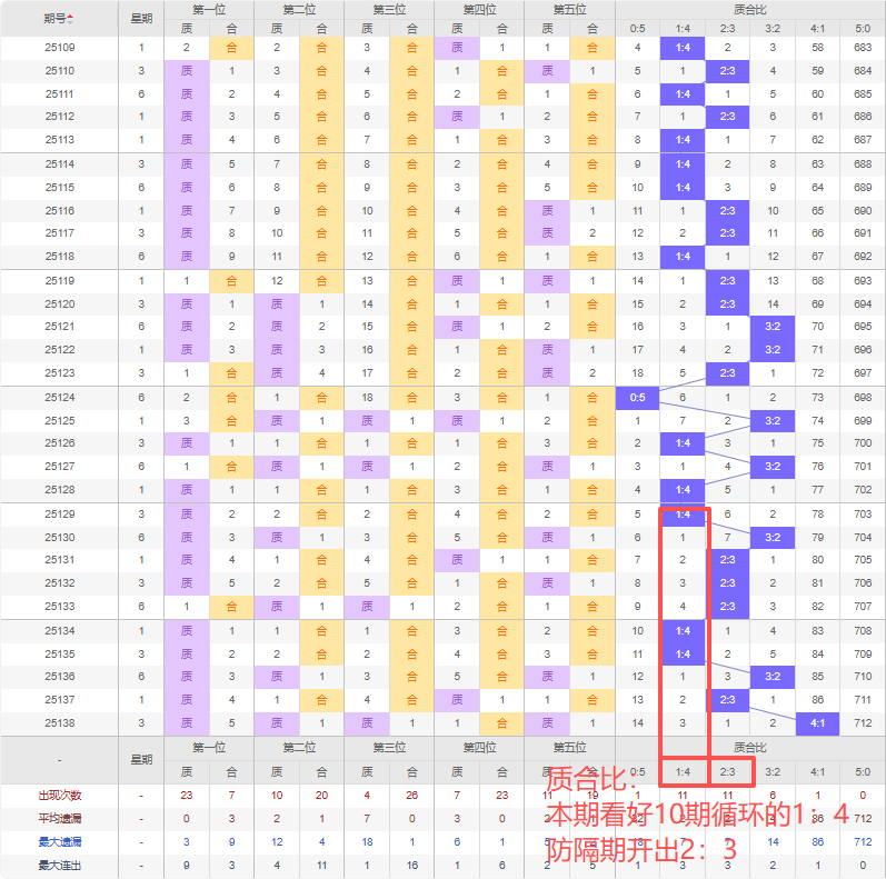 上期质合比:4:1,近10期质合比出现情况:1:4、3:2、2:3、2:3、2:3、1:4、1:4、3:2、2:3、4:1,最近10期出现3期3:2,出现3期2:3,出现1期4:1,出现3期1:4,出现0期5:0,出现0期0:5,根据近10期规律本期看好10期循环的1:4,防隔期出2:3,综上所述推荐质合比推荐:2:3,重点关注:1:4。