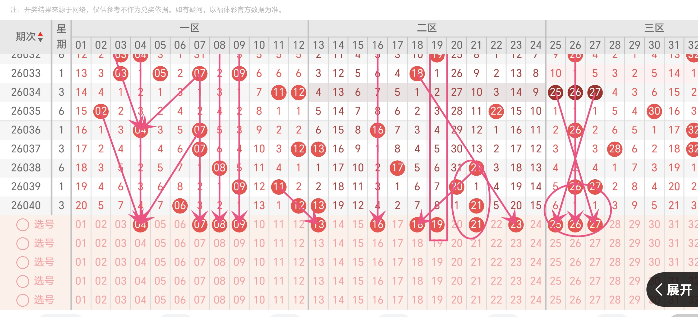 前区先看区间。上期三区只出1个,明显偏冷,本期选号里25、26、27都在,肯定要回补,至少出1-2个。一区04、07、08、09,上期出了2个,热度还在,继续留1-2个。中区13、16、18、19、21、23是核心,上期出2个,本期至少2个,区间比我更倾向2:2:1或2:3:0,不追极端。