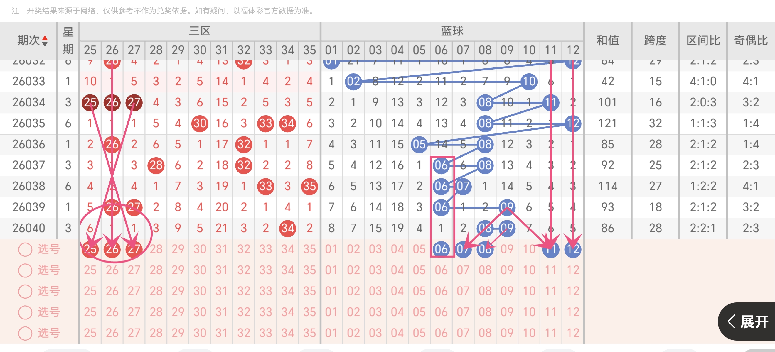 上期040期开出06、12、13、21、34+08、09,整体走得很稳:大小、奇偶都是2:3,区间2:2:1,前区有12、13连号,后区08、09也是连号,和值86、跨度28,属于均衡里带点小热的走势。本期我就顺着这个节奏,结合我的的选号来聊。