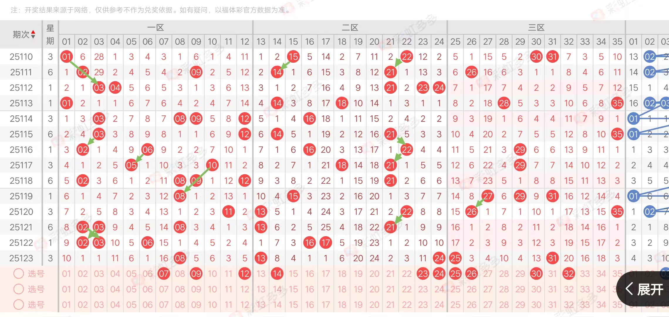 大乐透区间比:就是把1-35分成三个区,1区1-12,二区13-24,三区25-35,他们出现开奖号码的比。