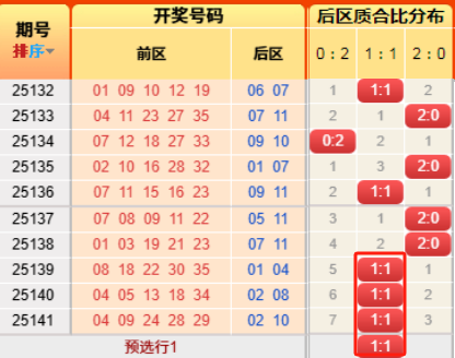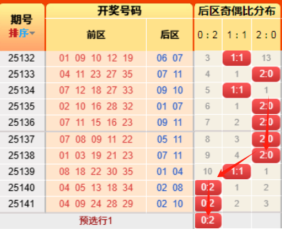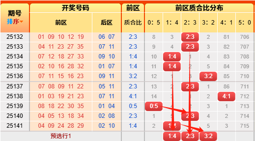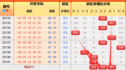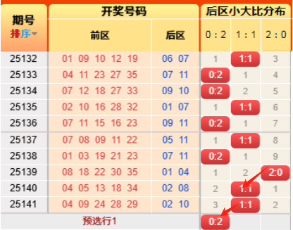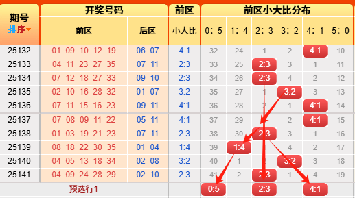 上期前区小大比2:3,小车命中,近期统计60期中53期。言归正传我们继续用历史数据说话,前区小大比分成6种0:5、1:4、2:3、3:2、4:1、5:0(如图),我统计了一下历史出现次数,0:5出现106次、1:4出现514次、2:3出现974次、3:2出现809次、4:1出现353次,5:0出现53次,再看近10期小大比出现次数比为0:1:4:2:3:0,通过历史数据对比观察以及根据遗漏对称理论原则,故本期我们选择2:3、4:1、0:5;(具体精准方向请查看小车小大比精选)