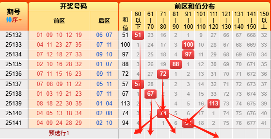 上期开出和值94,本次我们先根据历史次数统计,和值60以下开出249次、61-70开出235次、71-80开出369次,81-90开出486次、91-100开出497次,101-110开出380次、111-120开出313次、121-130开出155次、131-140开出90次、141-150开出26次、150以上开出9次,再来看近十次以上和值分别开出了2次、1次、2次、1次、3次、0次、1次、0次、0次、0次、0次 ,低于阈值的有60区间以下、61-70区间、81-90区间、91-100区间、101-110区间、121-130区间,再根据遗漏斜率对称理论,本期注意60区间以下、61-70区间、81-90区间、111-120区间。