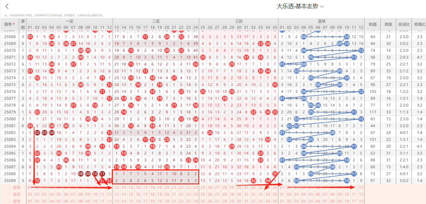 1、前区特征分析:(通过整体走势不难看出每期开奖号都具备以下明显的特征点)