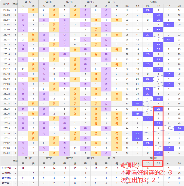 上期奇偶比:3:2,近10期奇偶比出现情况:3:2、1:4、2:3、3:2、5:0、1:4、1:4、2:3、4:1、3:2,最近10期出现3期3:2,出现2期2:3,出现1期4:1,出现3期1:4,出现1期5:0,出现0期0:5,根据近10期规律本期看好斜连的2:3,防连出3:2,综上所述推荐奇偶比推荐:3:2,重点关注:2:3。
