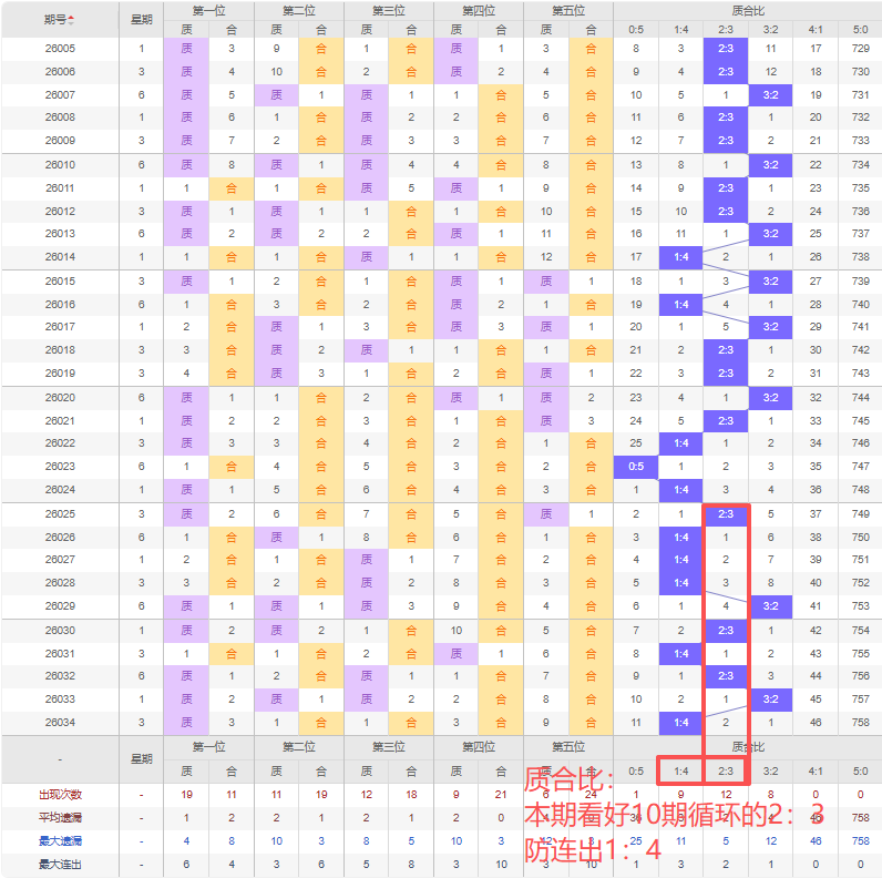 上期质合比:1:4,近10期质合比出现情况:2:3、1:4、1:4、1:4、3:2、2:3、1:4、2:3、3:2、1:4,最近10期出现2期3:2,出现3期2:3,出现0期4:1,出现5期1:4,出现0期5:0,出现0期0:5,根据近10期规律本期看好10期循环的2:3,防连出1:4,综上所述推荐质合比推荐:1:4,重点关注:2:3。