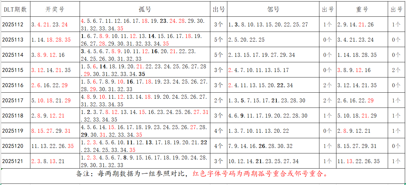 如图,以近两期数据为一组,进行对比分析,相同的孤号、邻号可能在下期开出。本期参考孤号:5.6.10.111.15.16.17.18.19.23.24.25.26.27.28.29.30.31.32.33.34.35;邻号:1.4.7.9.12.14.20.22。重点关注:孤邻号重合号码:***(会员专区可见)。个人分析,仅供参考。
