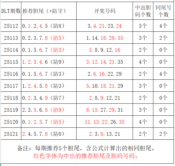 分享第三个数据分析:依据推荐的胆尾,推定胆码号码。每期计算出5个胆尾,做为推荐胆尾。以近10期推荐胆尾的统计数据为例: