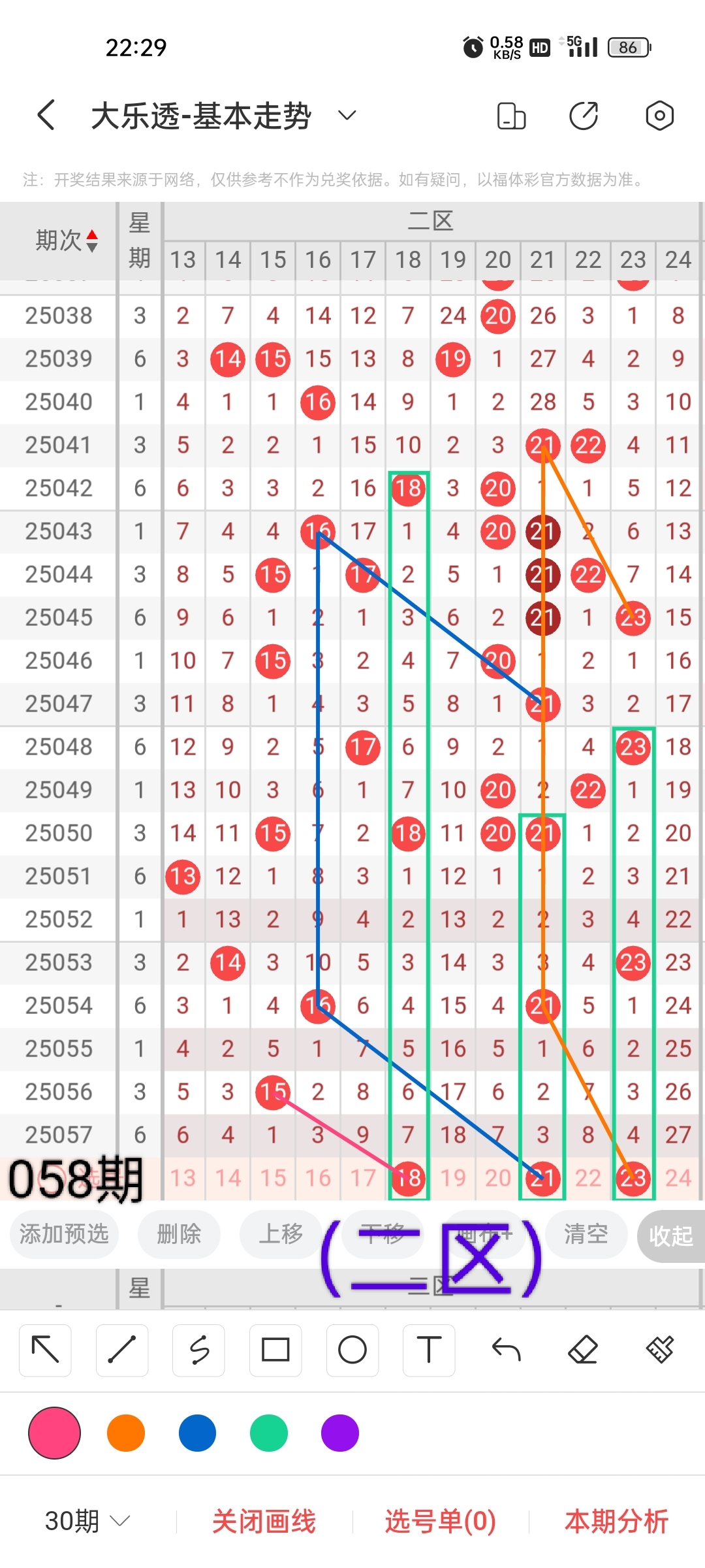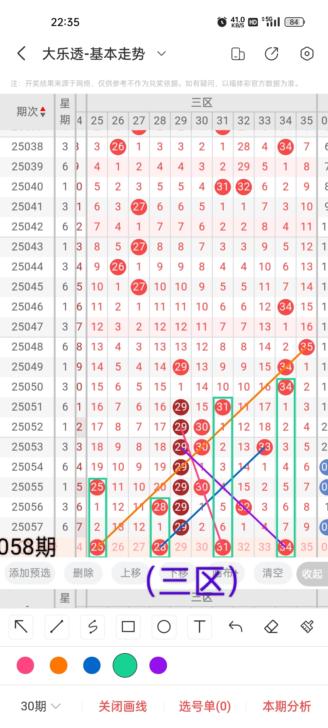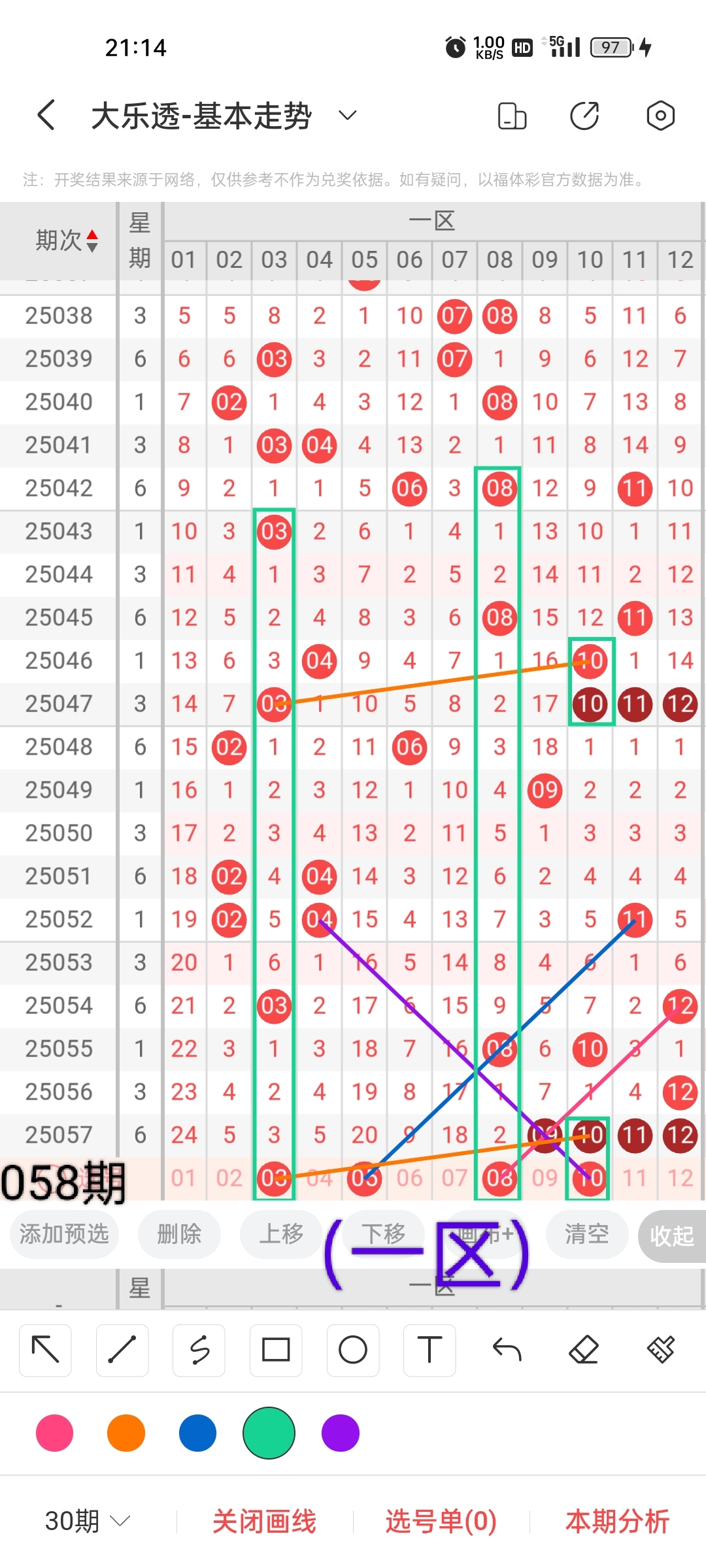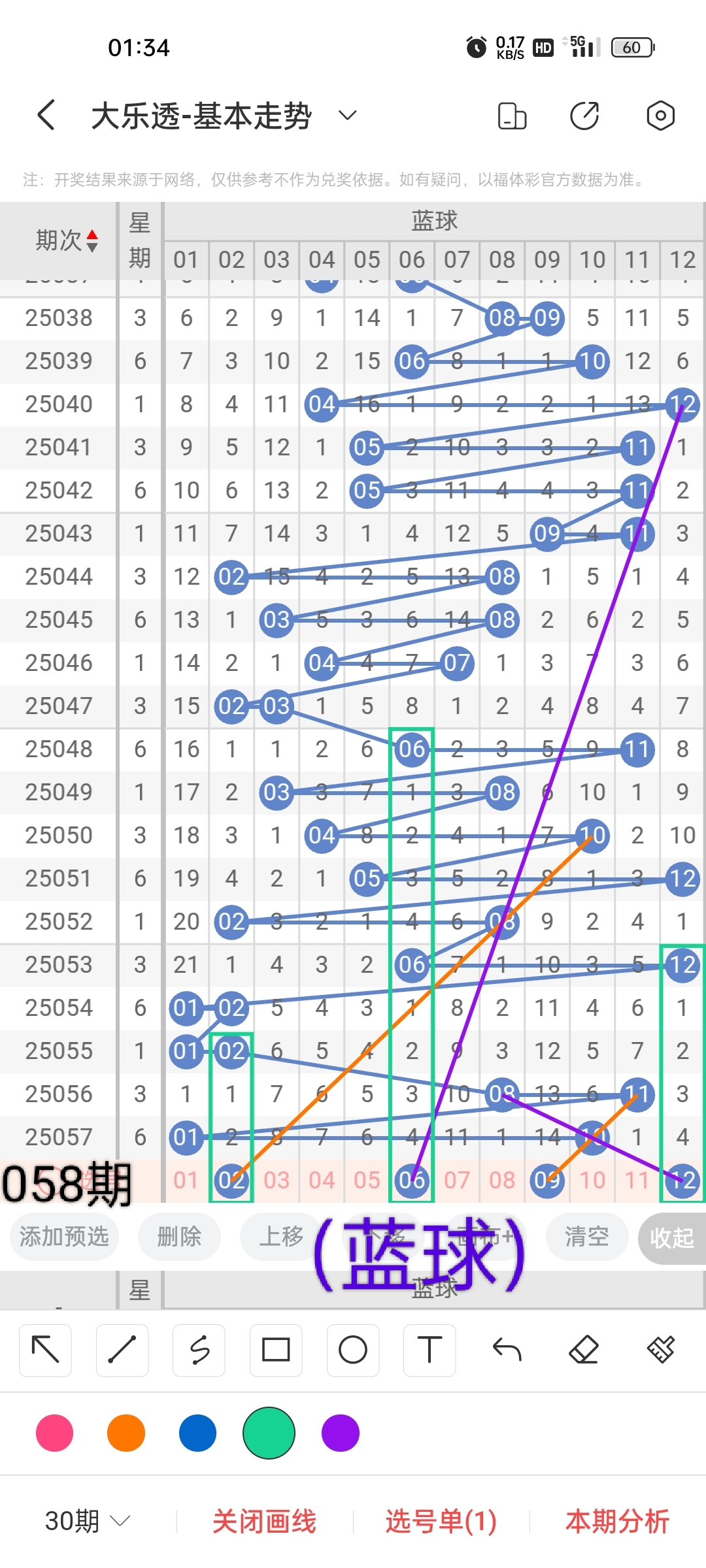 通过以上对上期的简单回顾,下面进入大乐透第2025058期(下面简称本期)的选号分析: