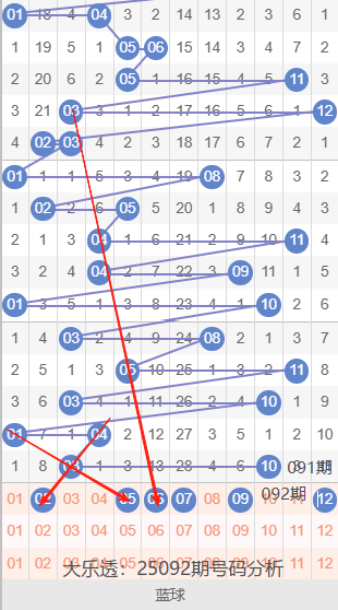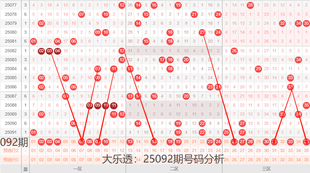 通过上期号码的简单分析,我们看下25092期红色号码球的总体走势,如下图:
