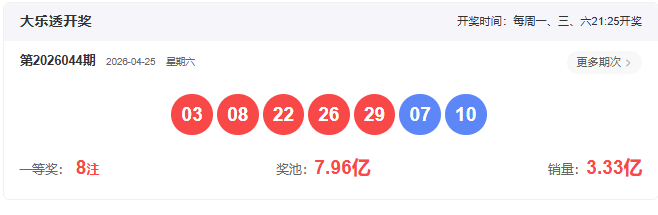 开奖号码:03 08 22 26 29- 07 10