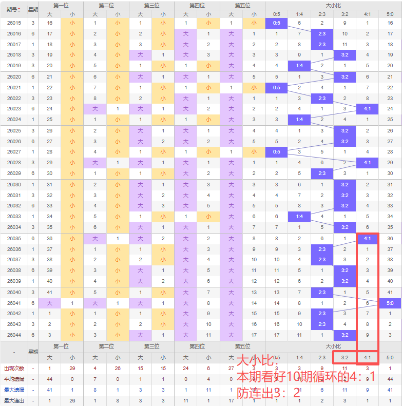 上期大小比:3:2,近10期大小比出现情况:4:1、2:3、2:3、3:2、3:2、2:3、5:0、2:3、2:3、3:2,最近10期出现3期3:2,出现5期2:3,出现1期4:1,出现0期1:4,出现1期5:0,出现0期0:5,根据近10期规律本期看好10期循环的4:1,防连出3:2,综上所述推荐大小比推荐:3:2,重点关注:4:1。