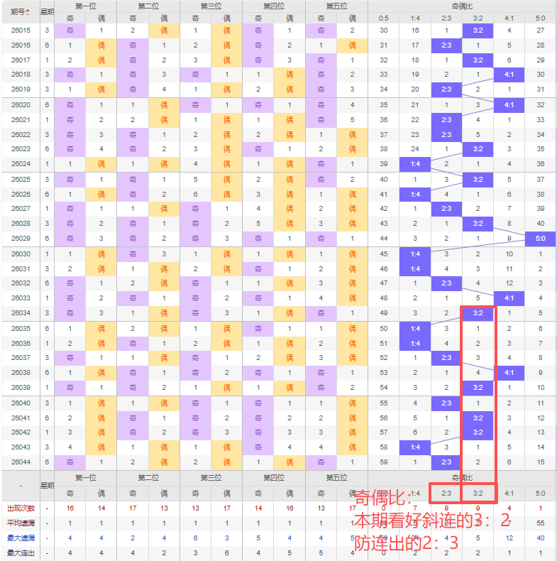 上期奇偶比:2:3,近10期奇偶比出现情况:1:4、1:4、2:3、4:1、3:2、2:3、3:2、3:2、1:4、2:3,最近10期出现3期3:2,出现3期2:3,出现1期4:1,出现3期1:4,出现0期5:0,出现0期0:5,根据近10期规律本期看好斜连出的3:2,防连出2:3,综上所述推荐奇偶比推荐:2:3,重点关注:3:2。