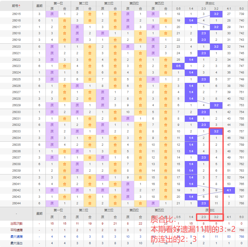 上期质合比:2:3,近10期质合比出现情况:1:4、1:4、2:3、1:4、1:4、1:4、1:4、4:1、1:4、2:3,最近10期出现0期3:2,出现2期2:3,出现1期4:1,出现7期1:4,出现0期5:0,出现0期0:5,根据近10期规律本期看好遗漏11期出3:2,防连出的2:3,综上所述推荐质合比推荐:2:3,重点关注:3:2。