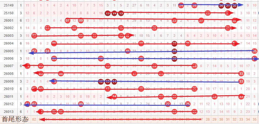 如图所示:首尾制约平衡组范围依次为:缩推推,推推? 本期形态范围优先选择红色压缩首尾。由于上期号码处在首尾换4然后中间右推本期交换首尾移动空间连续分割形成间隔1正在重复走势预计本期继续形成走势,本期宜采取继续左推走势常规起号,或体现间隔1和连号走势。