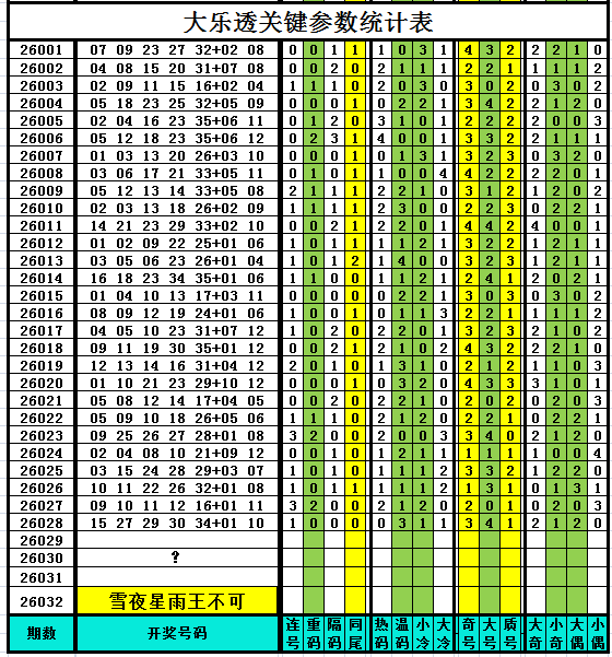 以下是作者手工统计的大乐透关键参数统计表,对喜欢参数分析、过滤缩水、选号胆杀的技术性大乐透爱好者有所帮助,其它读者可略过不看。