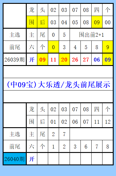 26039 期开奖 09、11、20、26、27+06、09,前区呈现三奇两偶,连号与同尾号码走势平稳,后区开出奇偶组合,落点于中位区间。
