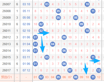 上图是体彩大乐透后区开奖号码走势分布图,我在上面走势图中标出来的数字我觉得后区第二个数字可以关注的范围,这些数字是08 09 10 11 12,你们看看上面走势图中标出来的蓝色箭头表示的第二个数字最近开出的跨度,上期跨度是6,上上期跨度是5,上上上期跨度是5,那么本期可以关注小跨度的数字,那么假设出小跨度的话,那么范围就是08 09 10 11 12。