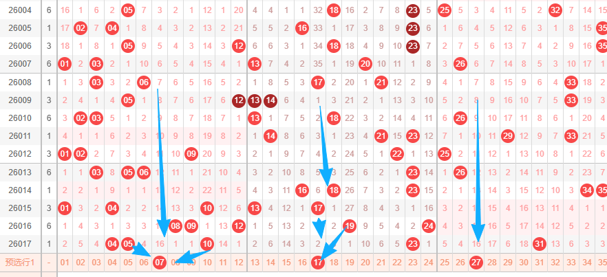 上图是体彩大乐透前区开奖号码走势分布图,我在上面走势图中标出来的数字都是7尾数的数字07 17 27,你们看看上面标出来的蓝色大箭头表示的就是7尾数数字最近的遗漏周期情况,最近7尾数的数字出现的并不是很多,那么本期个人觉得7尾数的数字07 17 27至少要考虑出1个吧,其中数字07和上面的号码关联附近的号码,还有数字17也是的。