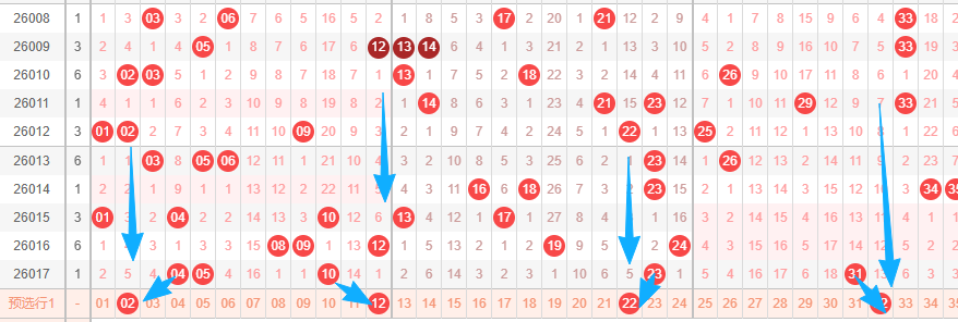 上图是体彩大乐透后区开奖号码走势分布图,我在上面走势图中标出来的蓝色小箭头表示的就是左边这个数字开出的都是奇数数字,最近第一位数字连续开出了6期奇数数字,那么本期第一位数字出偶数数字的机会就有了,本期关注第一位数字出偶数数字,假设出偶数数字的话,那么第一位数字范围就是02 04 06 08。