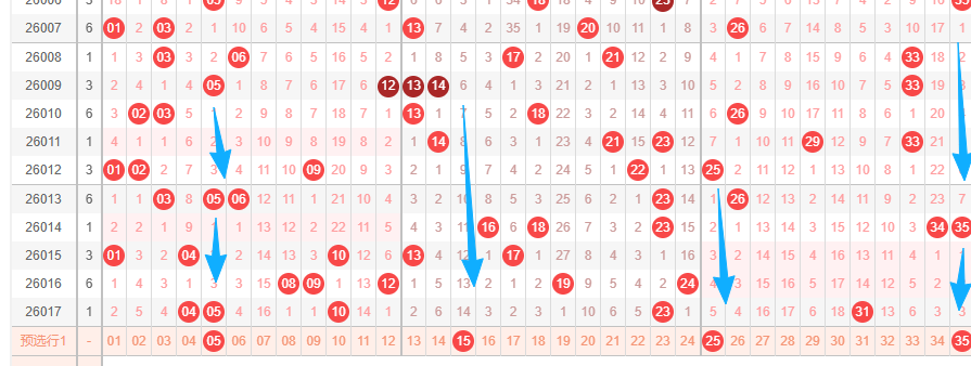上图是体彩大乐透前区开奖号码走势分布图,我在上面走势图中标出来的数字都是5尾数的数字05 15 25 35,你们看看上面走势图中标出来的蓝色大箭头表示的就是最近5尾数的数字遗漏周期,看这些蓝色大箭头就知道,5尾数数字近期开出的不是很多,那么本期开出5尾数的数字个人觉得应该考虑出1个或者2个。