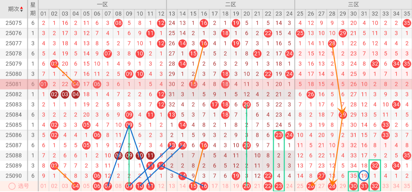 三区(25-35)分析:上期该区开出号码27,近10期占比18%,与上期相比+2%。本期无三斜连号趋势,无隔码斜连走势。近5期出号量较低,有1期断区,其他期以1码为主,冷态已成趋势。 本期大概率维持1码,或断区(概率22%)。推荐关注号码:26、28、30、31、32。