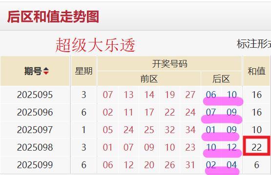近五期大乐透开奖号码后区和值依次为16→16→10→22→6。后区和值均值为14。后区和值振幅为16,后区和值修正振幅为13。基于动态平衡干预以及波动趋势衡量,本期后区和值推测区间为1-23。基于风险对冲策略,本期后区和值区间缩水为6-18。