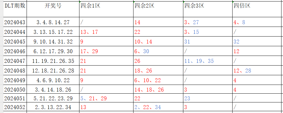 按照这样的分区,可以直观的分析区间冷热走势,便于总结区间出号规律。以近10期四分区的统计数据为例: