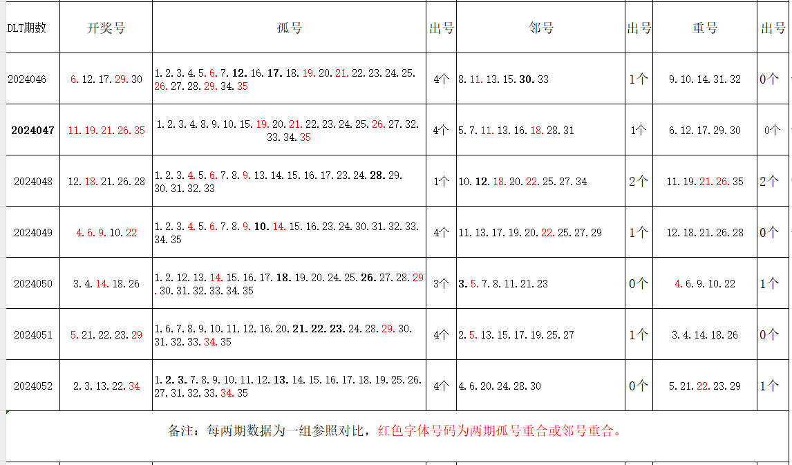如图,以近两期数据为一组,进行参照对比。举例说明:第一组24046-047期,两期相同的孤号19、21、26、35,相同的邻号11,都在047期开出。第二组24048-049期,两期相同的孤号4、6、9,相同的邻号22,都在049期开出。由此可见,两期相同的孤号、邻号,大概率会在下期开出。